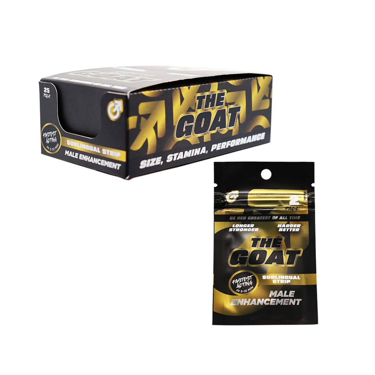 Be her Greatest Of All Time! These fast acting and quick dissolving sublingual strips will let you last longer and get harder. The proprietary blend of 250mg of active ingredients per strip work in 5 -10 minutes. No side effects. No addiction. No stomach upset.  2 strips per pack. Each pack has an eye hook for easy display.
